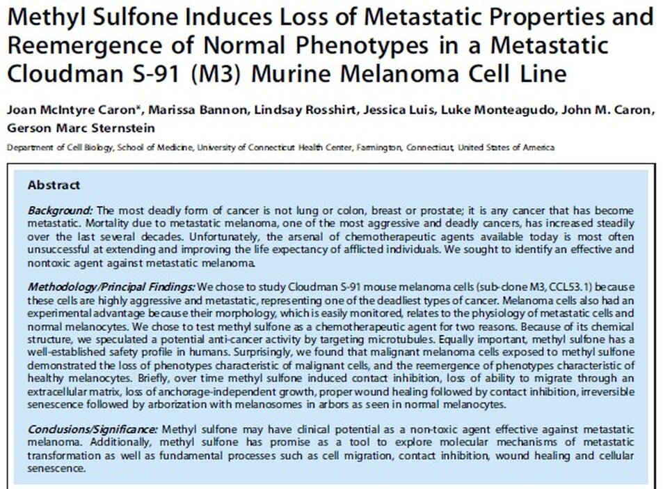 Here is the summary of a 2010 scientific study that shows the therapeutic properties of MSM in the treatment of melanoma, a severe autoimmune disease. Methyl sulfone is the most common pharmacology name for MSM. Its most technically accurate name is dimethyl sulfone (DMSO2).