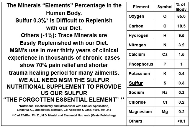 Unlike as demonstrated by Dr. Stanley W. Jacob, M.D., F.A.C.S., with over 30,000 patients, in over thirty years of clinical experience, and over six hundred peer reviewed published studies by hundreds of other scientists; MSM a constituent of every living organism is already a constituent of our body by itself found in the adrenal glands, in the blood and in the urine of humans and animals.